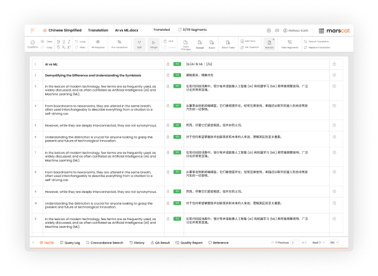 Combine the speed of AI with the precision of human linguists. MarsCloud integrates machine translation, large language models, and quality assurance tools for flawless multilingual output that meets enterprise-grade quality standards.