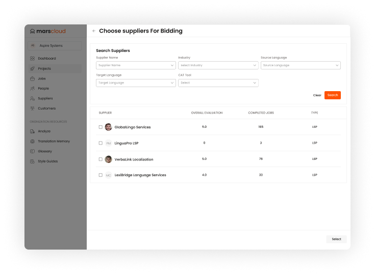 MarsCloud allows clients to invite multiple suppliers, compare proposals, and select the most suitable resources, optimizing cost, quality, and efficiency for every translation project.